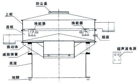 超聲波振動篩,由立式振動電機軸的上下兩端的偏心重錘產生振動源,使超聲波振動篩參振的上部在水平、垂直、傾斜方向做三次元運動,調節上、下部重錘的相位角,可改變物料在篩面上各種不同的運動軌跡,來滿足各種不同比重物料的良好篩分或過濾,增減上、下部重錘附加重塊的數量,會產生不同的振動力,可以達到不同比重、不同目數(或孔徑)物料的良好篩分、過濾效果。
